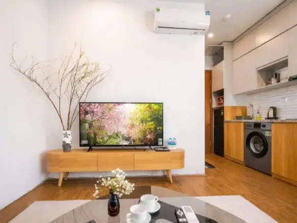 Ho Tung mau, Cầu Giấy(カウザイ区), Ha Noi立地はCầu Giấyの延長線上にある“便利さ強めエリア”。 Ho Tung Mau通りは大学やオフィスが多く、交通量は多めですが、並木がしっかりしていて生活の匂いもあるエリアです。周辺にはFPT University、National University、ミュージアム、スーパー、ローカル飲食店が集まり、“ハノイ西側で働く駐在さん”には動線が良いロケーション。 外観とつくりは、シンプル・モダンで整ったサービスアパート系。 白×グレー基調の外観で、レセプションはローカルティックな装飾の雰囲気。廊下や室内は過度な装飾がなく、清潔感を軸にしたつくりで、毎日の生活にストレスがありません。 部屋は明るさと実用性を重視した設計。 1BED〜2BED中心で、リビング・寝室ともに採光がしっかり取れる間取りが多いです。木目を使った家具、柔らかい色合いのソファ、広めのクローゼットなど、“長く暮らす前提”の設備が揃うタイプ。キッチンはIHコンロ・電子レンジ・大きめのシンクなど、日常調理に不便がない構成。 設備とサービスは...