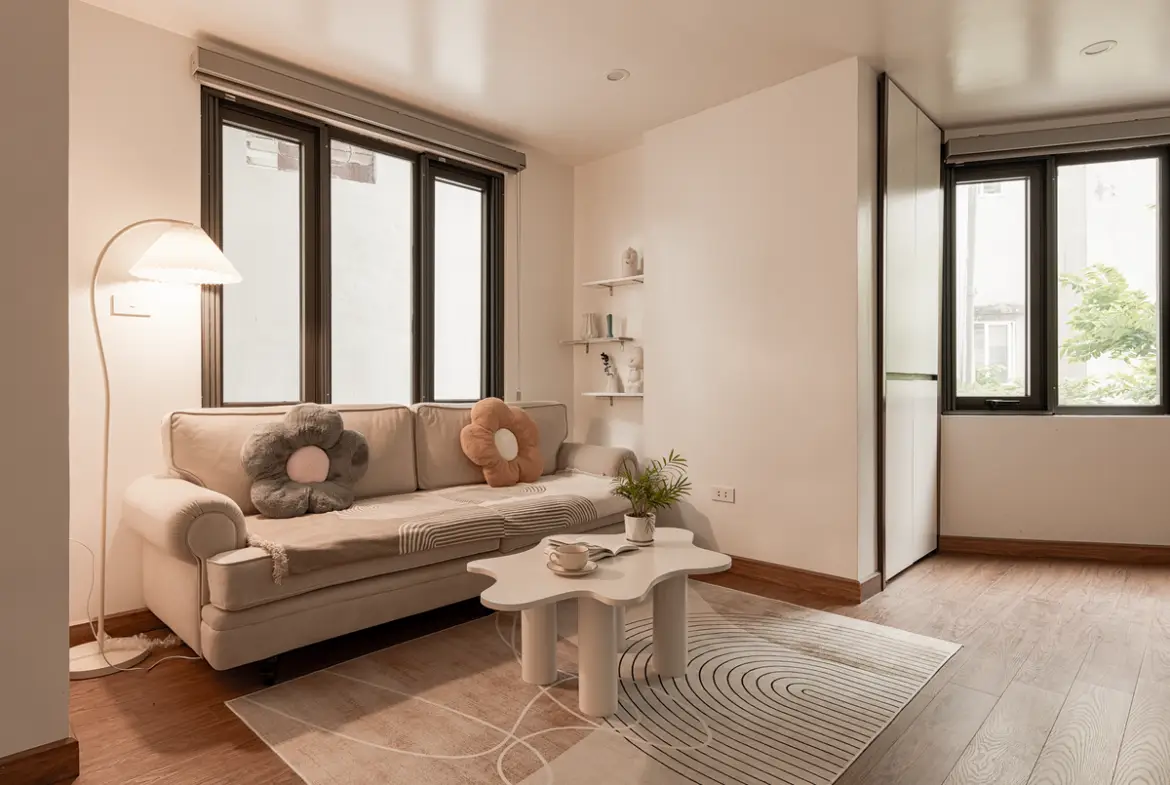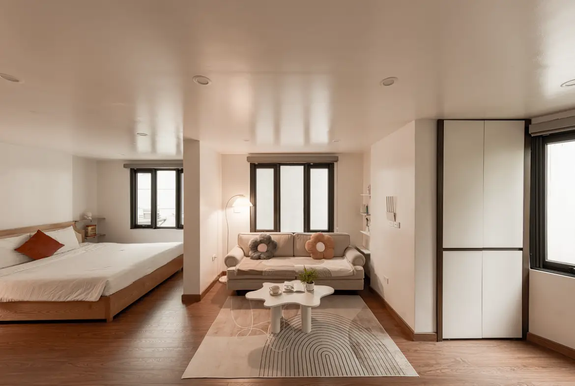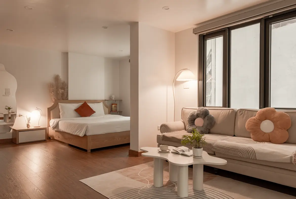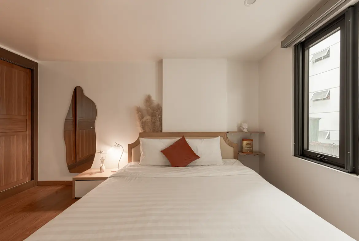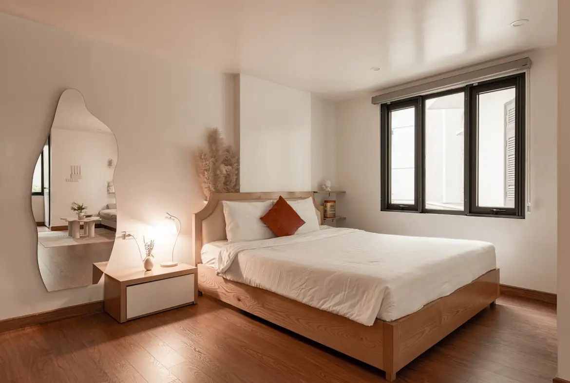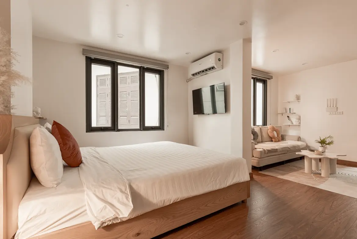 まず間取り。1ベッドルーム中心で、リビングと寝室がしっかり分かれています。ベトナム物件にありがちな“なんでもワンルーム化”ではなく、生活と睡眠の境界線がちゃんと引かれている。これは地味ですが、在宅ワークや長期滞在ではかなり大事なポイントです。