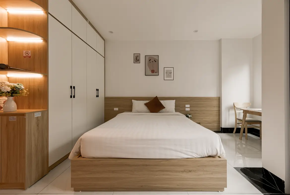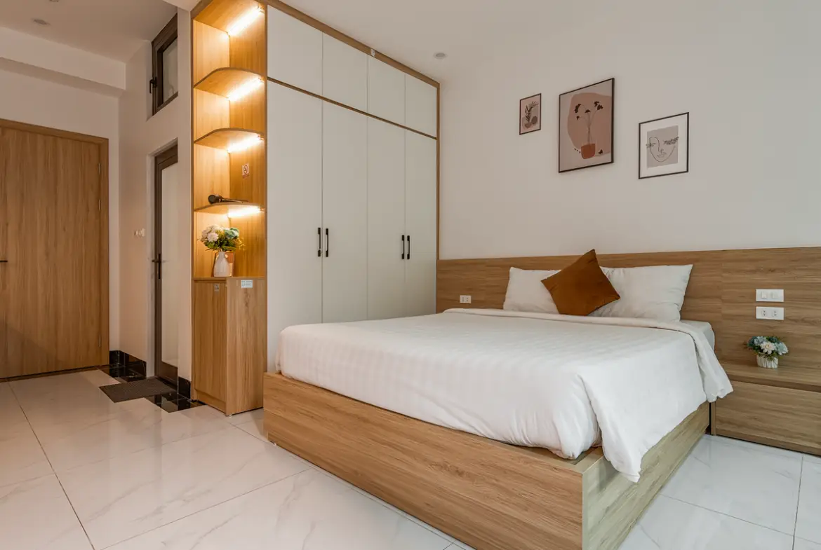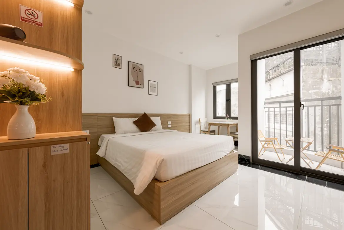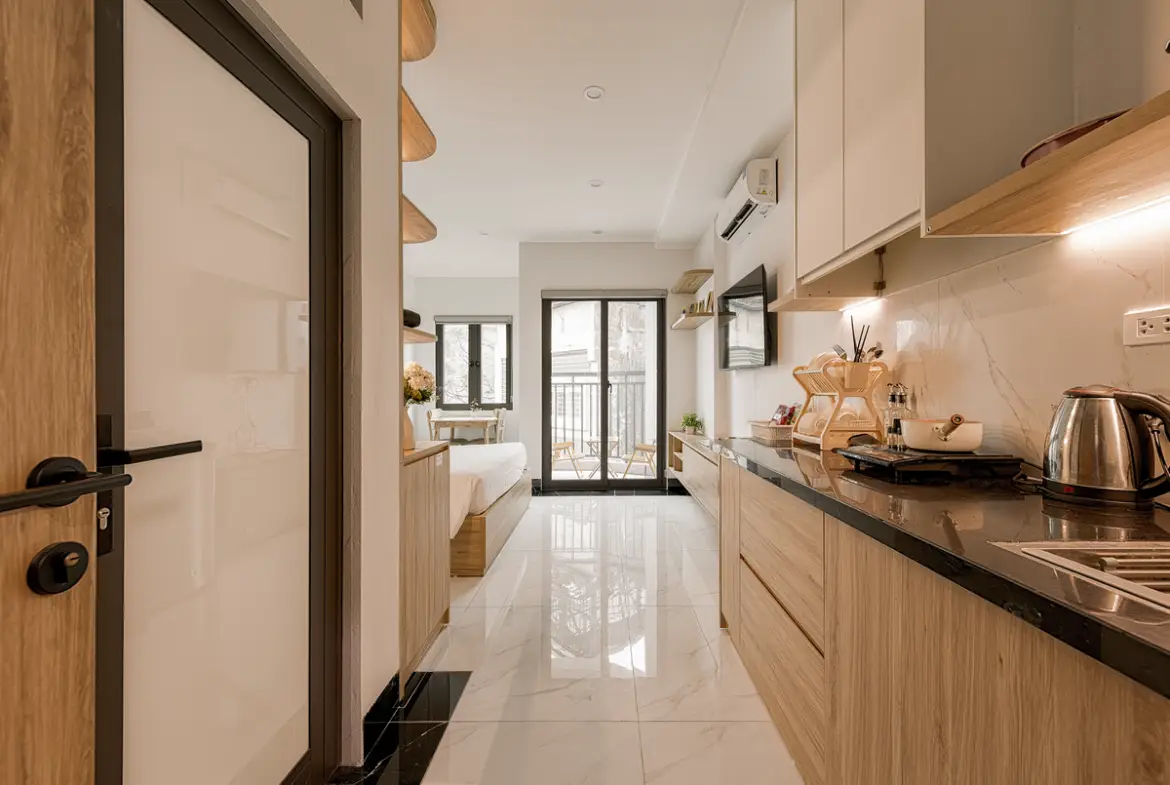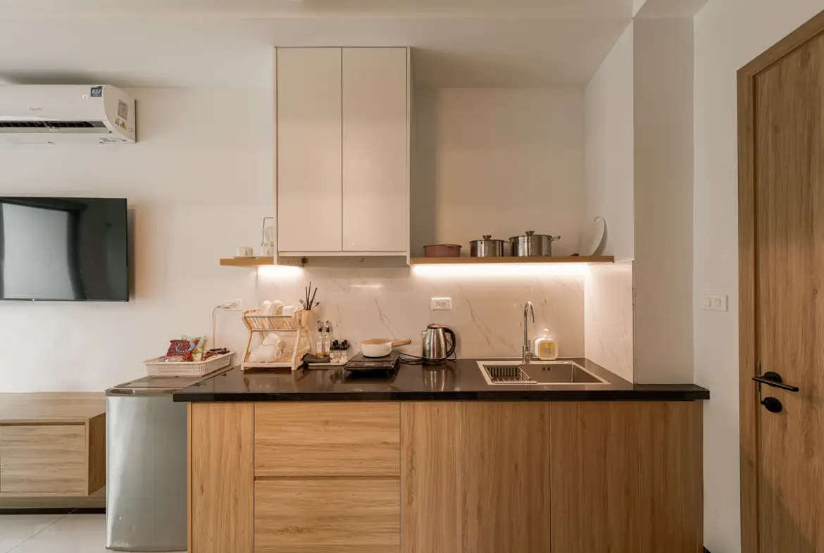 建物は比較的新しく、外観・共用部ともにシンプルで清潔感のあるデザイン。お部屋はスタジオタイプが中心で、単身者やカップルに適しています。室内はナチュラルテイストでまとめられ、長期滞在でも疲れにくい設計です。 この物件は「プライベートバルコニーがある」のが最大の特徴です。