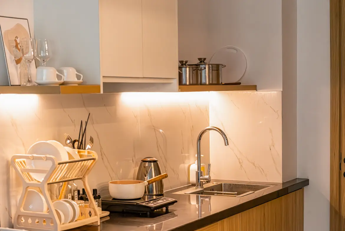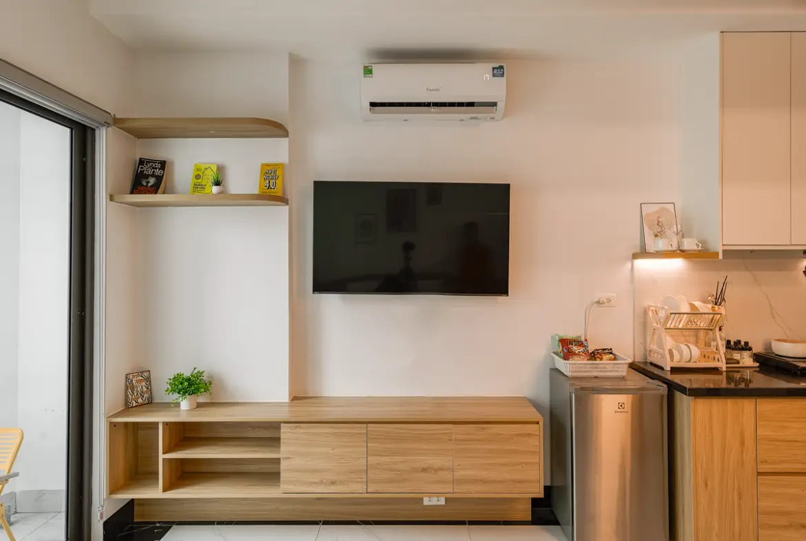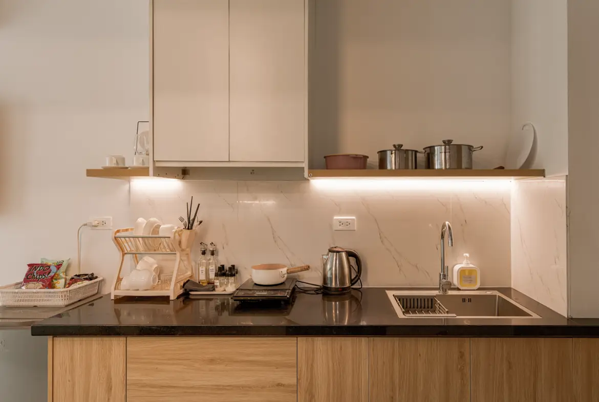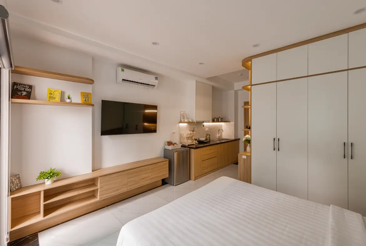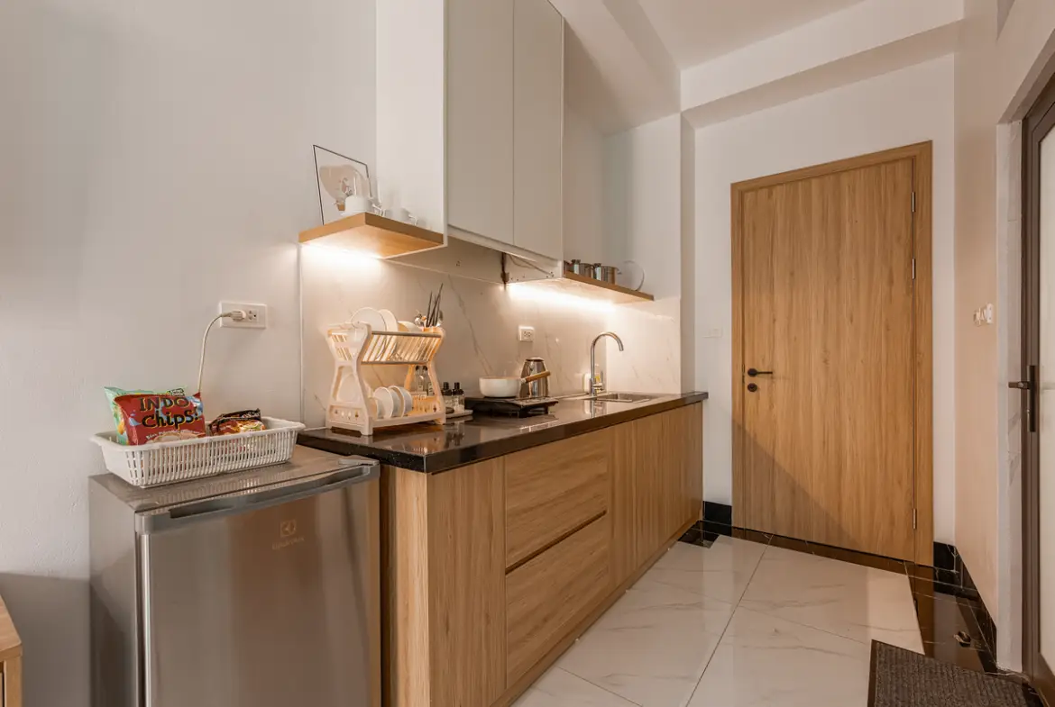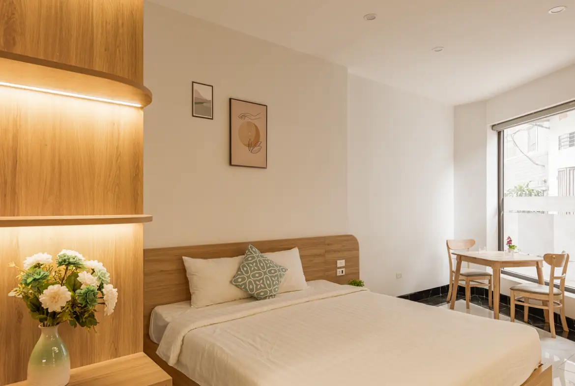 建物は比較的新しく、外観・共用部ともにシンプルで清潔感のあるデザイン。お部屋はスタジオタイプが中心で、単身者やカップルに適しています。室内はナチュラルテイストでまとめられ、長期滞在でも疲れにくい設計です。 この物件は「プライベートバルコニーがある」のが最大の特徴です。