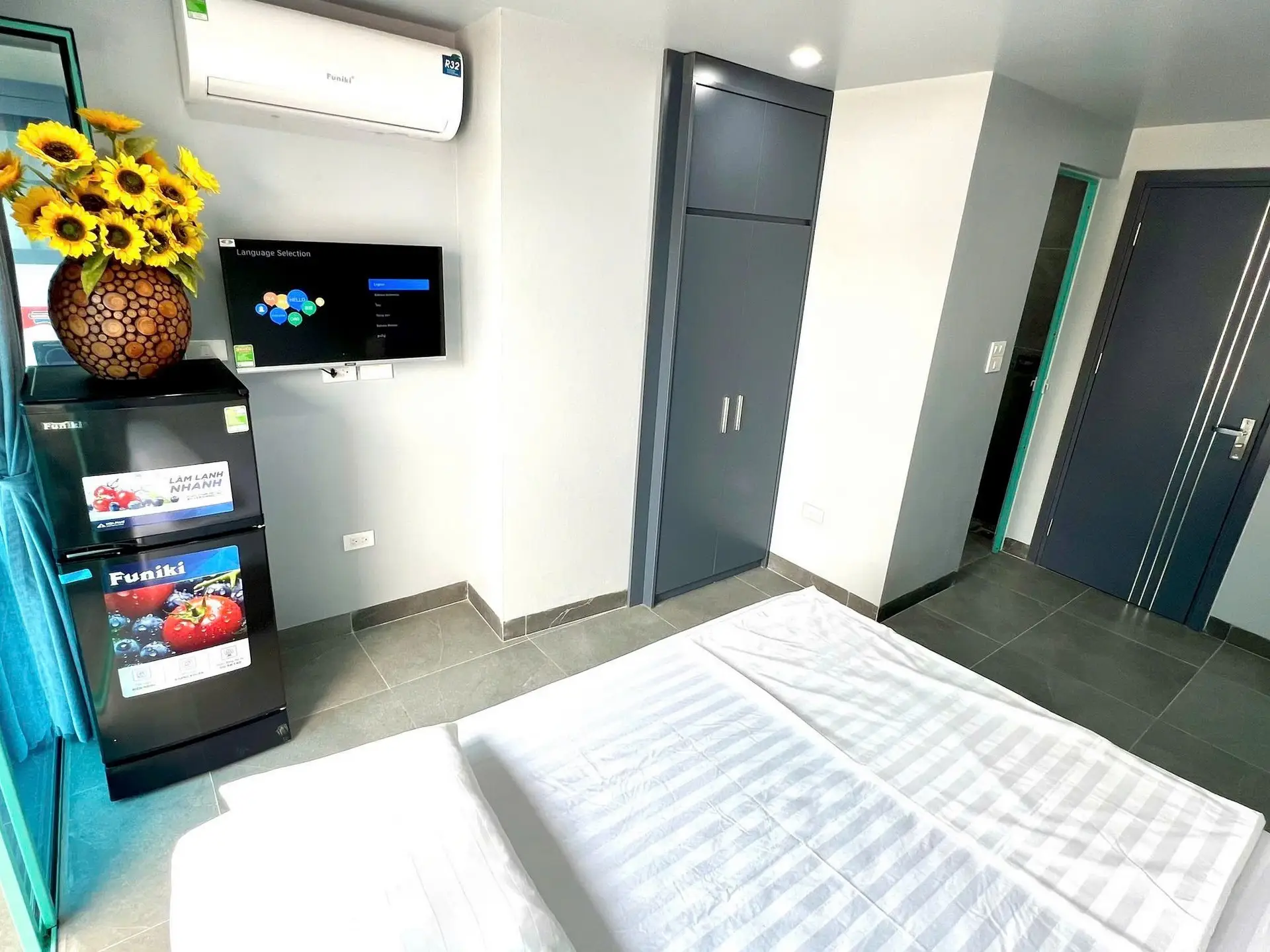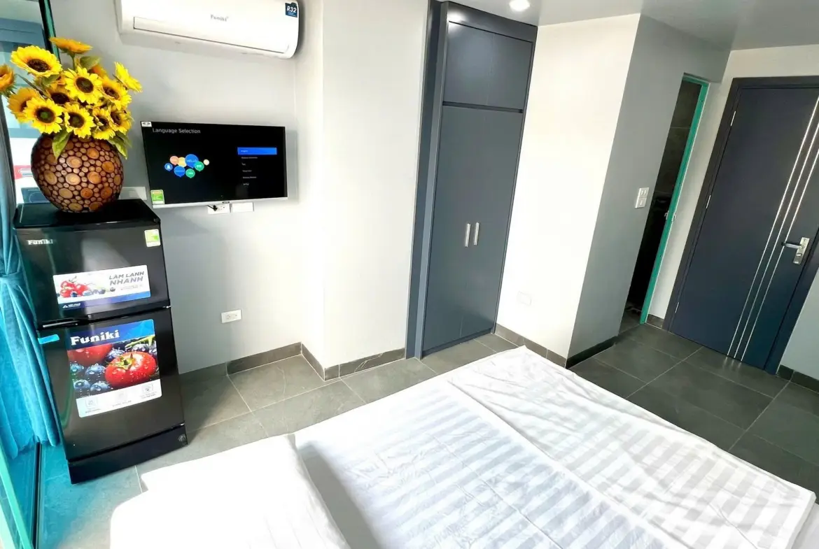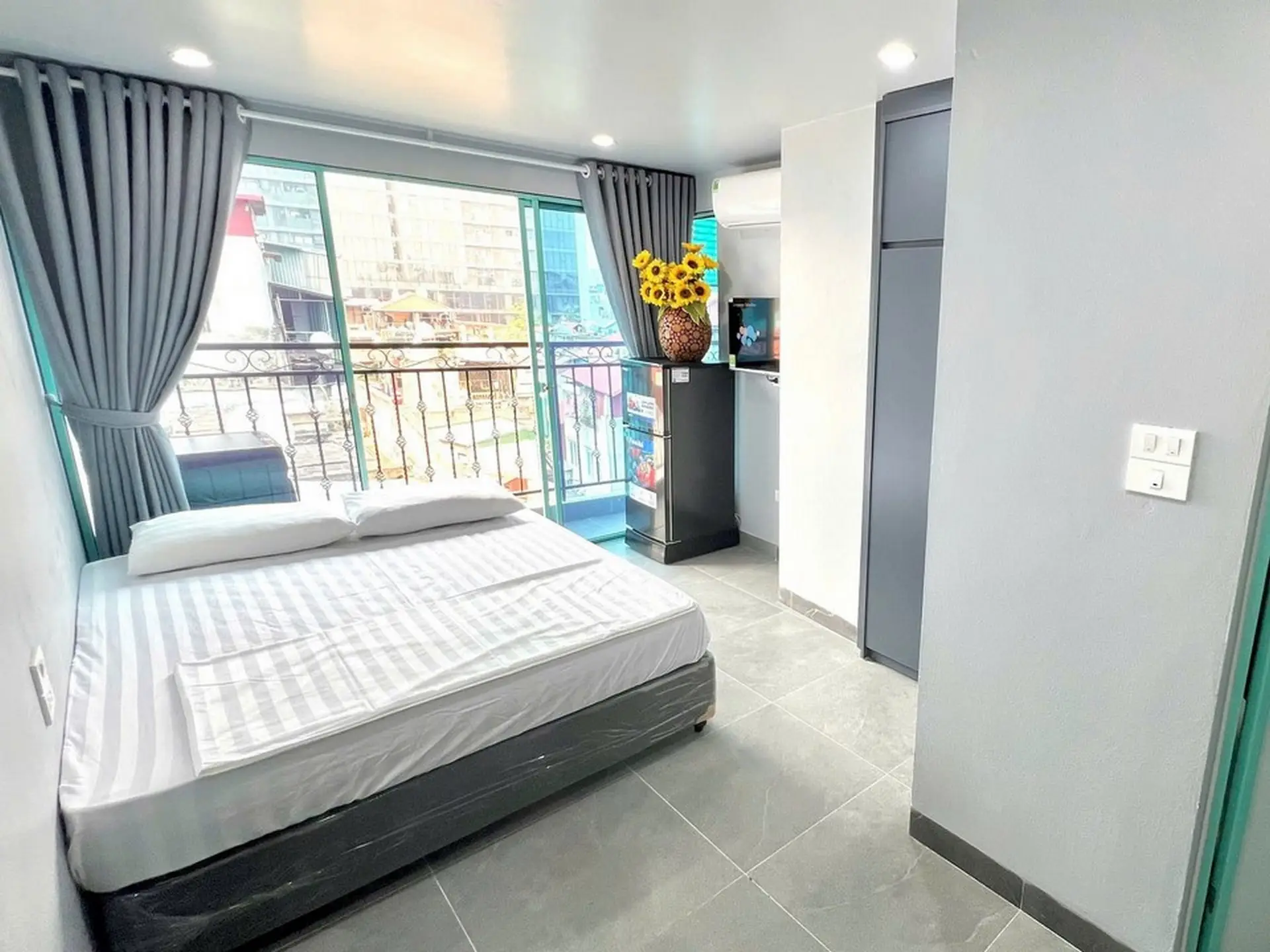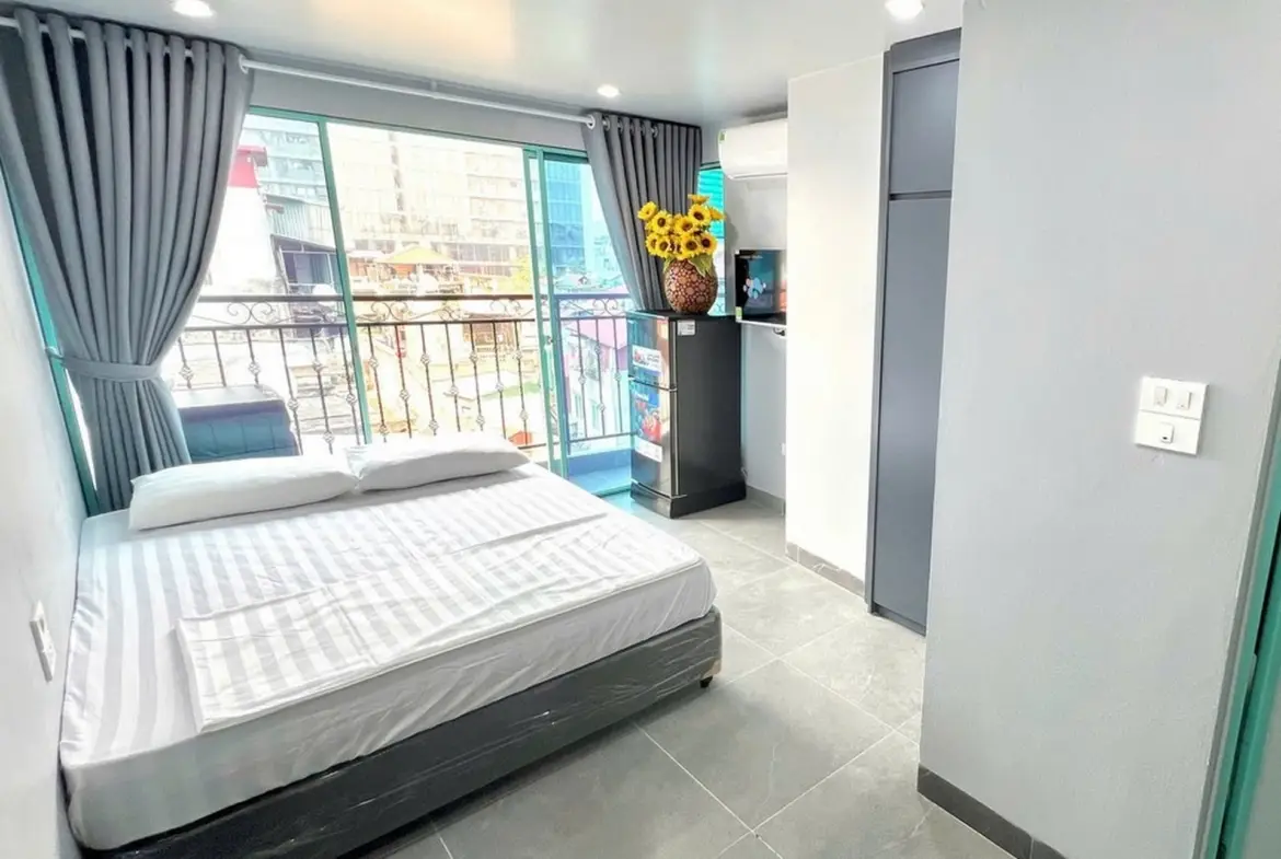エラ・アパートメント・カットリンの部屋は、コンパクトなワンルームタイプで、住居と生活スペースを効率的に設計しています。大きなガラス窓やスライドドアからバルコニーへ出られるようになっており、自然光がよく入り、開放感があります。