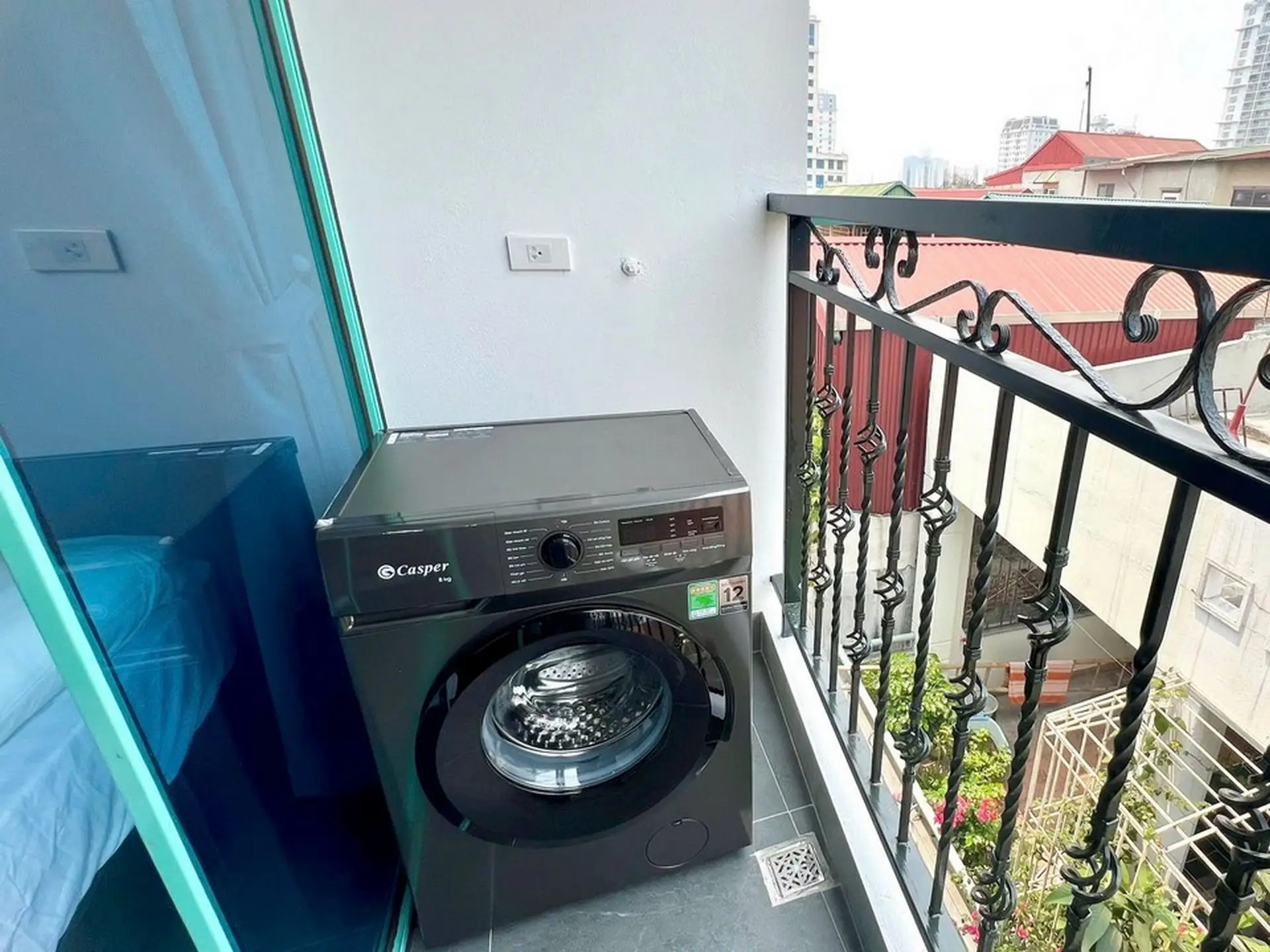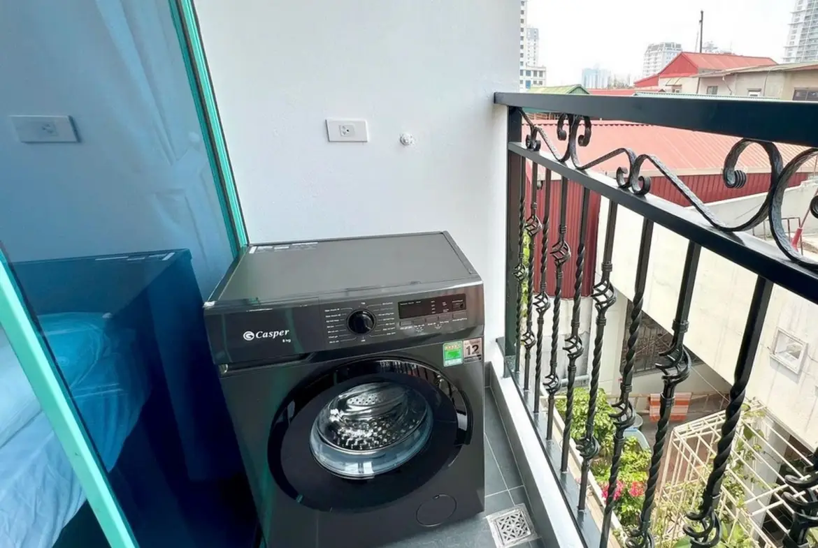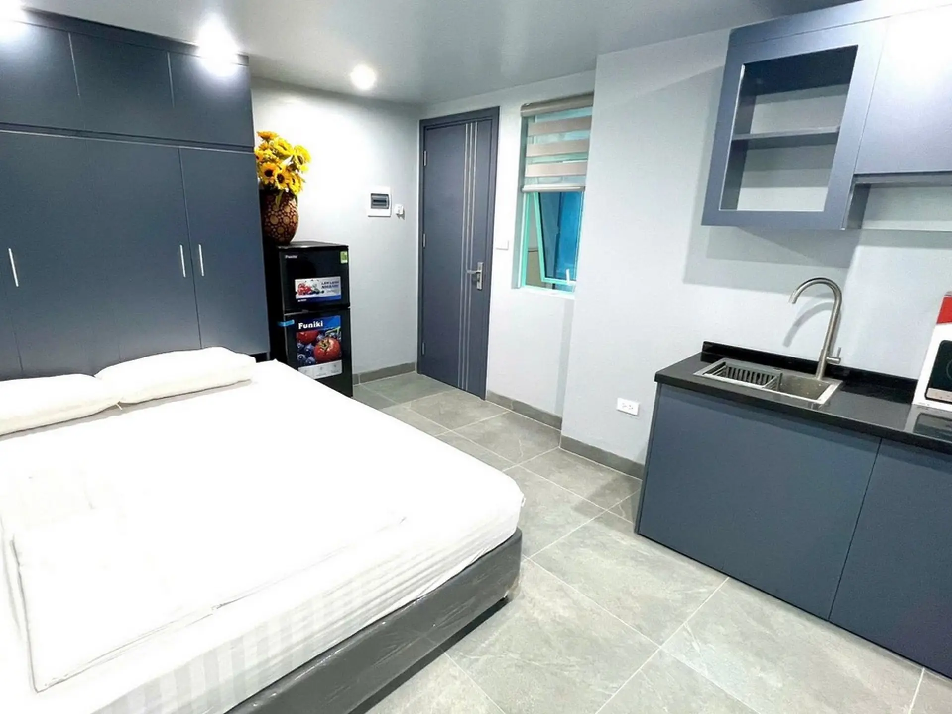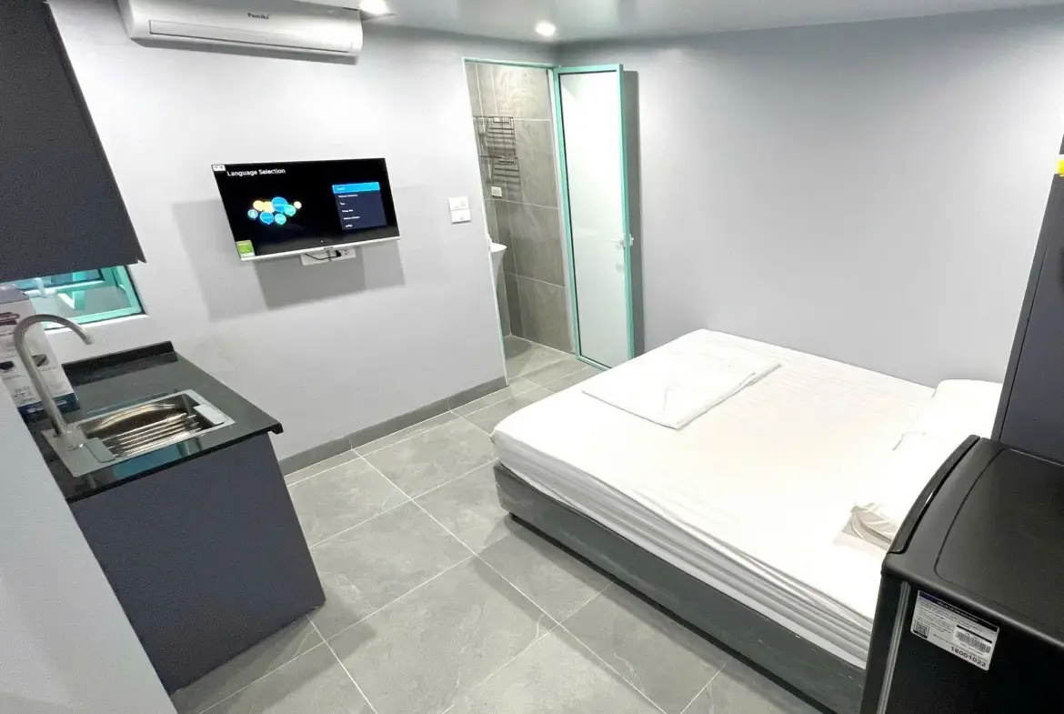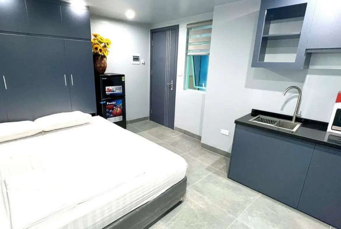 エラ・アパートメント・カットリンの部屋は、コンパクトなワンルームタイプで、住居と生活スペースを効率的に設計しています。大きなガラス窓やスライドドアからバルコニーへ出られるようになっており、自然光がよく入り、開放感があります。